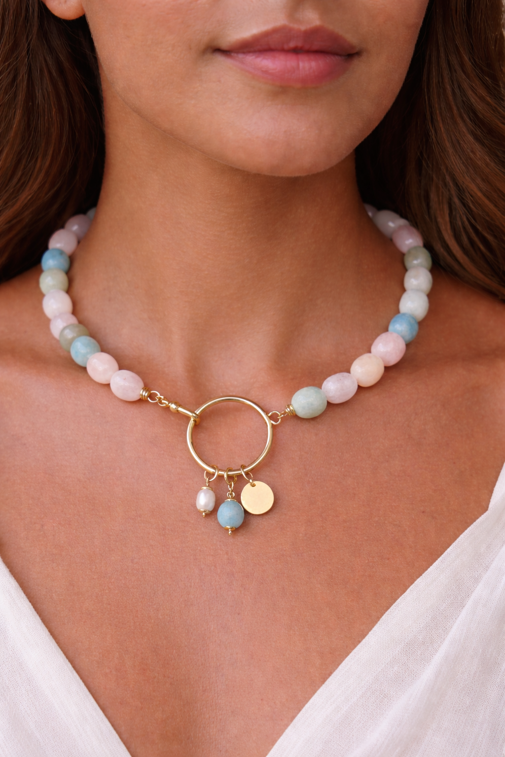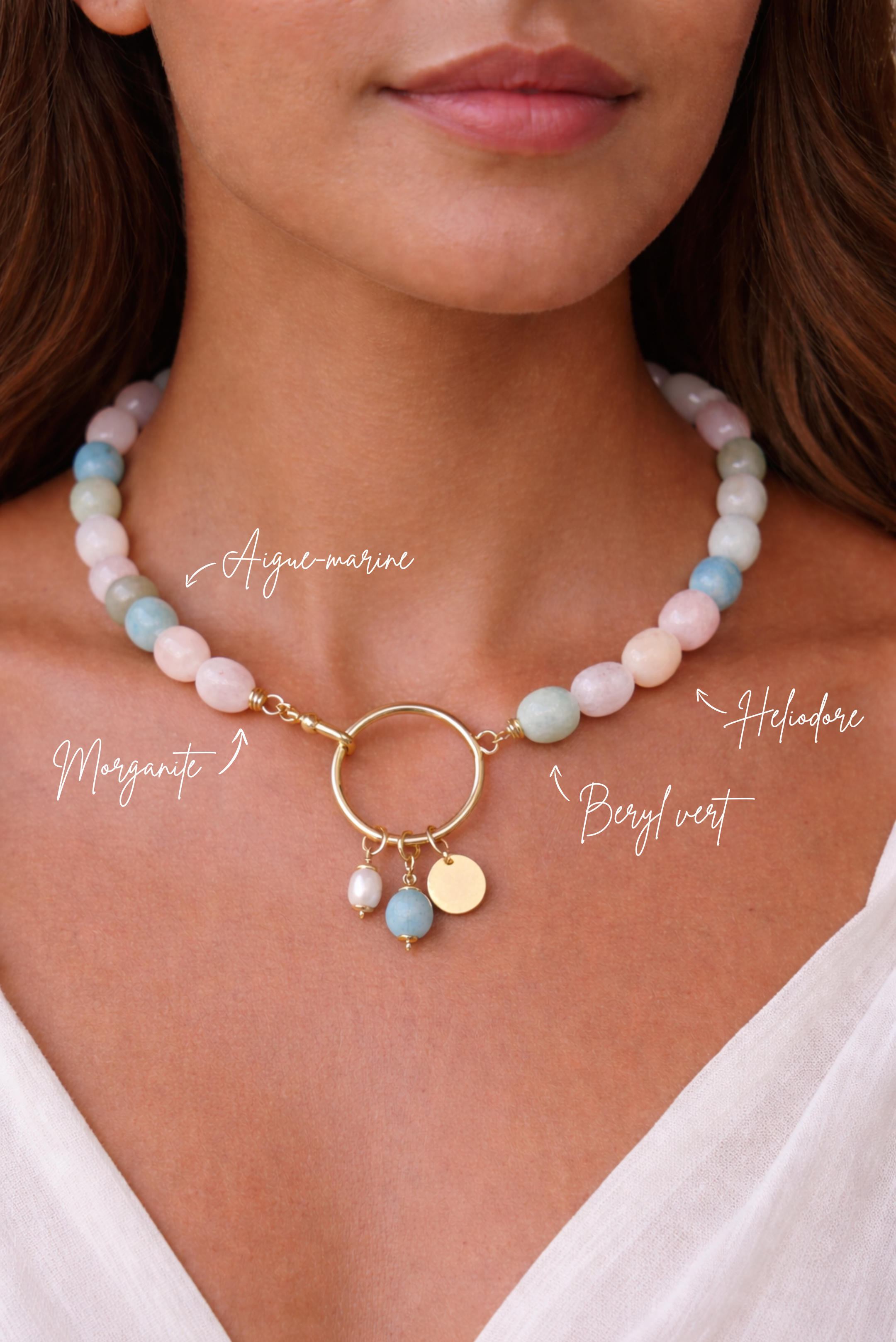 Vous aimez les pièces uniques et personnalisables ? Alors le collier Malaga est fait pour vous. Disponibles en deux exemplaires seulement et en édition limitée, c'est une création unique composée de jolies perles en aigue-marine, morganite, héliodore et beryl-vert.
